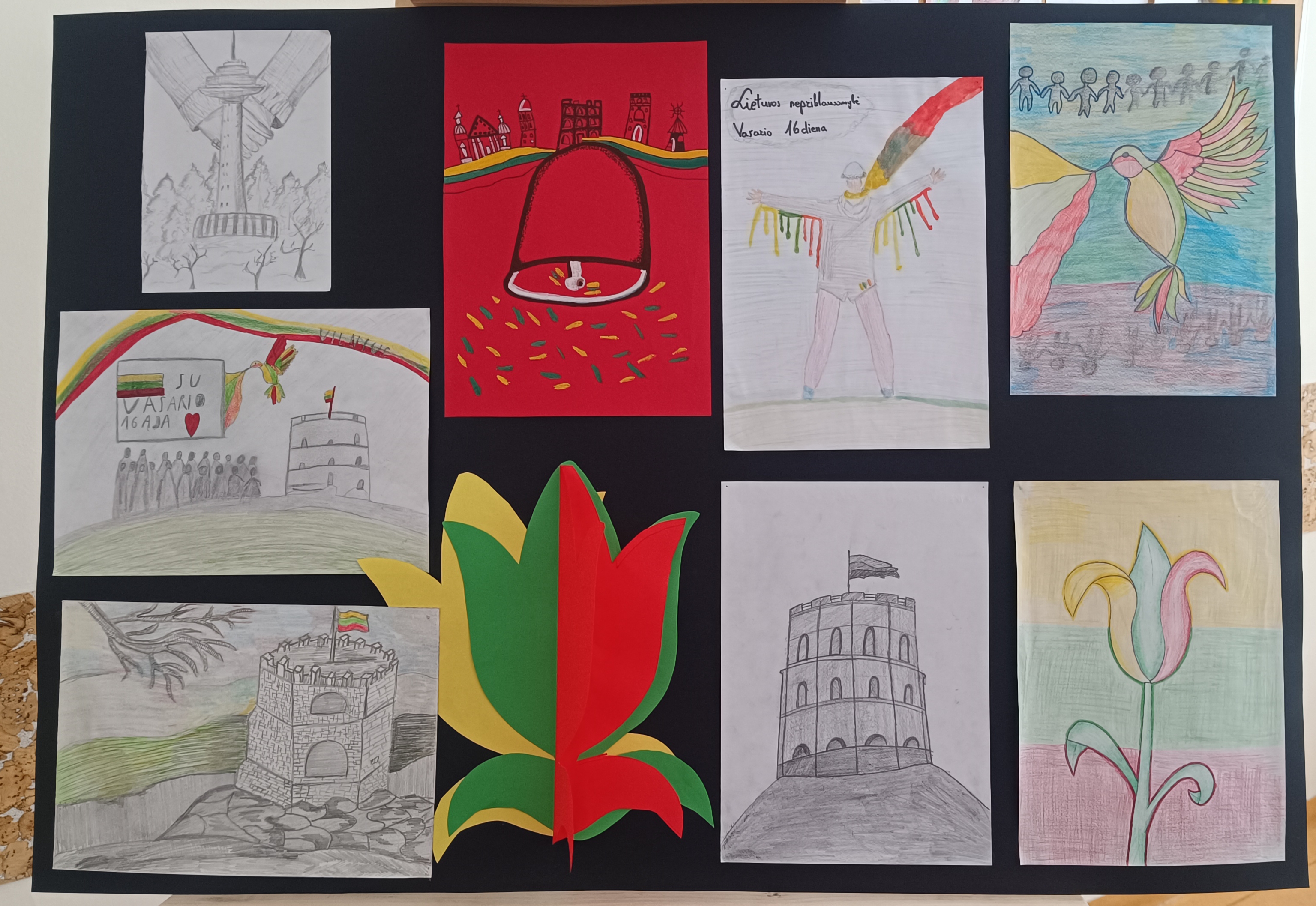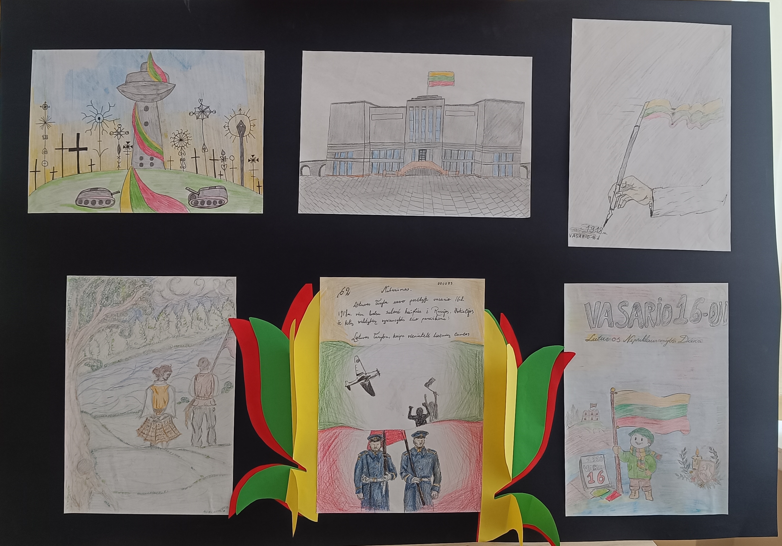 Parodai skirti darbai buvo sukurti dailės pamokose, kuriose mokiniai ne tik gilinosi į menines technikas, bet ir aptarė Lietuvos istorijos įvykius, valstybės simbolius bei Vasario 16‑osios reikšmę. Pamokų metu vyko diskusijos apie laisvę, pilietiškumą ir tautinę tapatybę, o šios temos natūraliai persikėlė į mokinių kūrybą. Dailės pamoka tapo erdve, kurioje istorija susitiko su menu, o mokinių idėjos virto spalvingais ir prasmingais piešiniais.