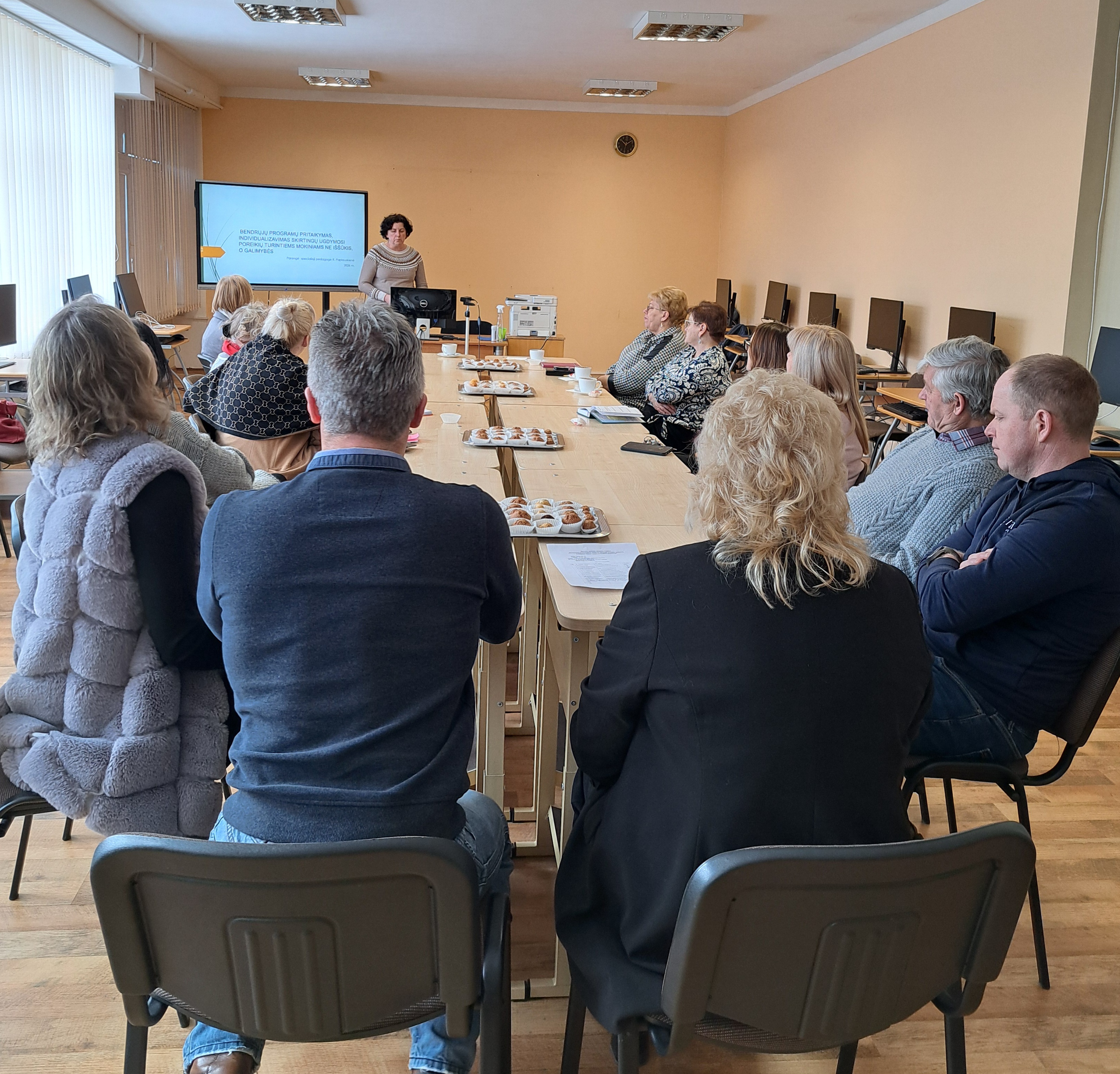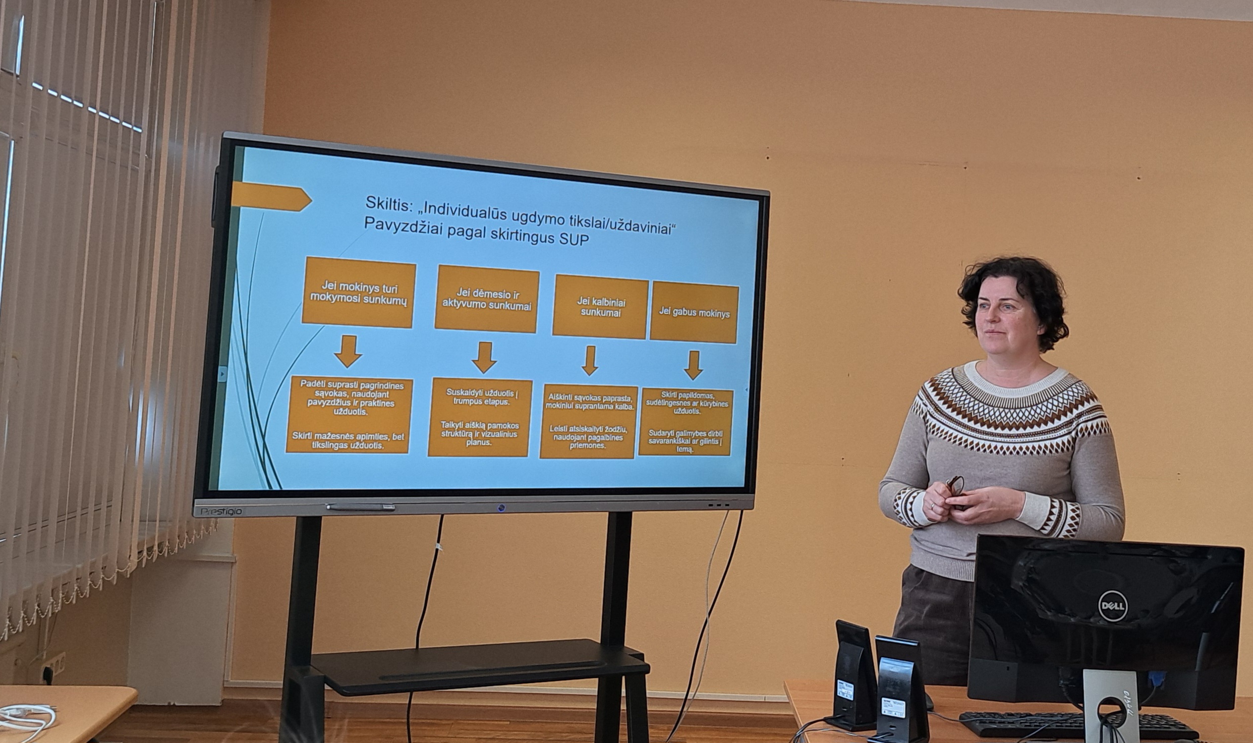 Specialioji pedagogė R. Paplauskienė pranešime apie bendrųjų programų pritaikymą ir individualizavimą pristatė konkrečius metodus, kaip diferencijuoti užduotis, taikyti įvairias atsiskaitymo formas bei naudoti vertinimo ir įsivertinimo įrankius, paremtus Universalaus dizaino mokymuisi principais. Buvo akcentuota, kad lanksčiai planuojant teorines ir praktines veiklas sudaromos sąlygos kiekvienam mokiniui siekti pažangos.