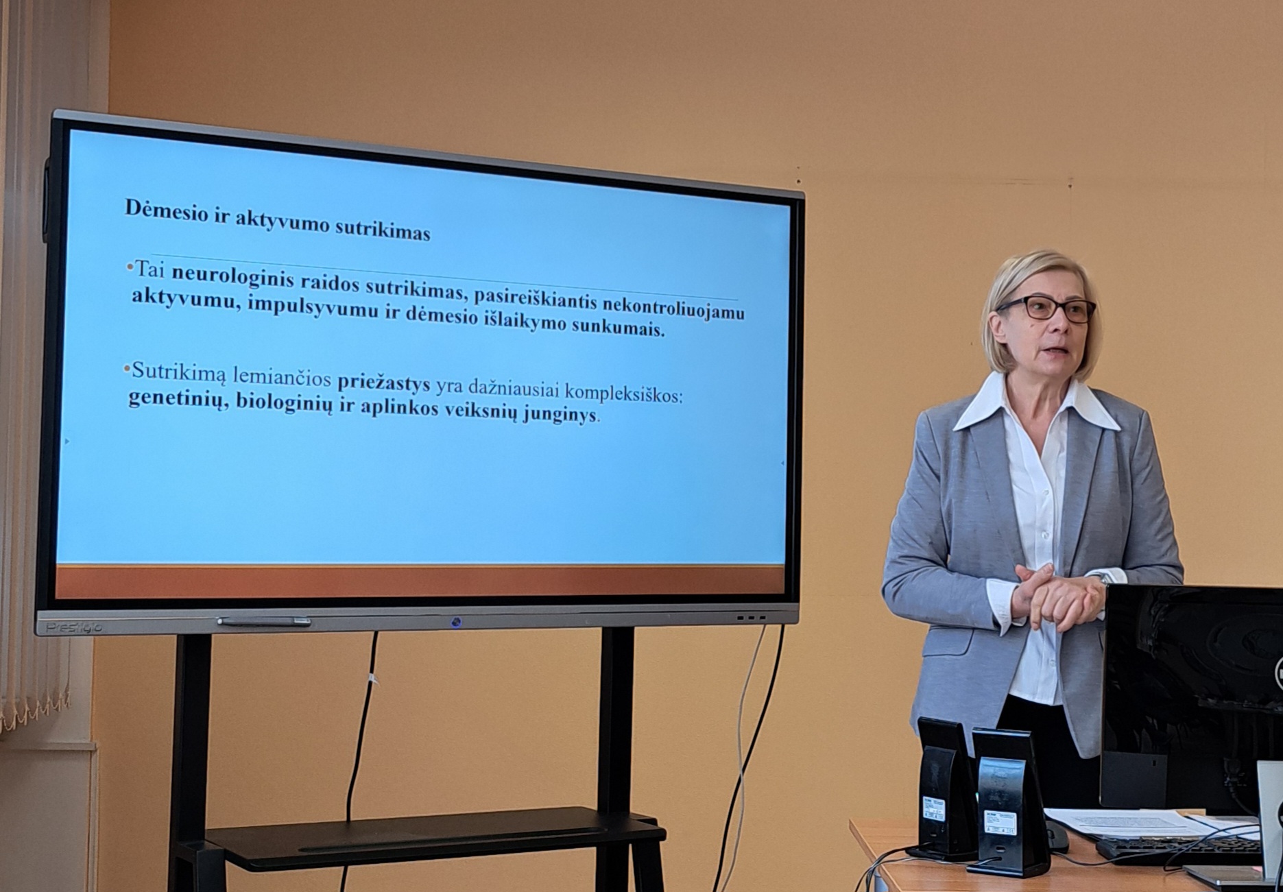Psichologė Aldona Ciūnytė aptarė aktyvumo ir dėmesio sutrikimo požymius – nedėmesingumą, hiperaktyvumą ir impulsyvumą – bei pristatė praktines rekomendacijas, kaip organizuoti mokymosi procesą, kad būtų stiprinama mokinių savivertė ir kuriama palanki emocinė aplinka.