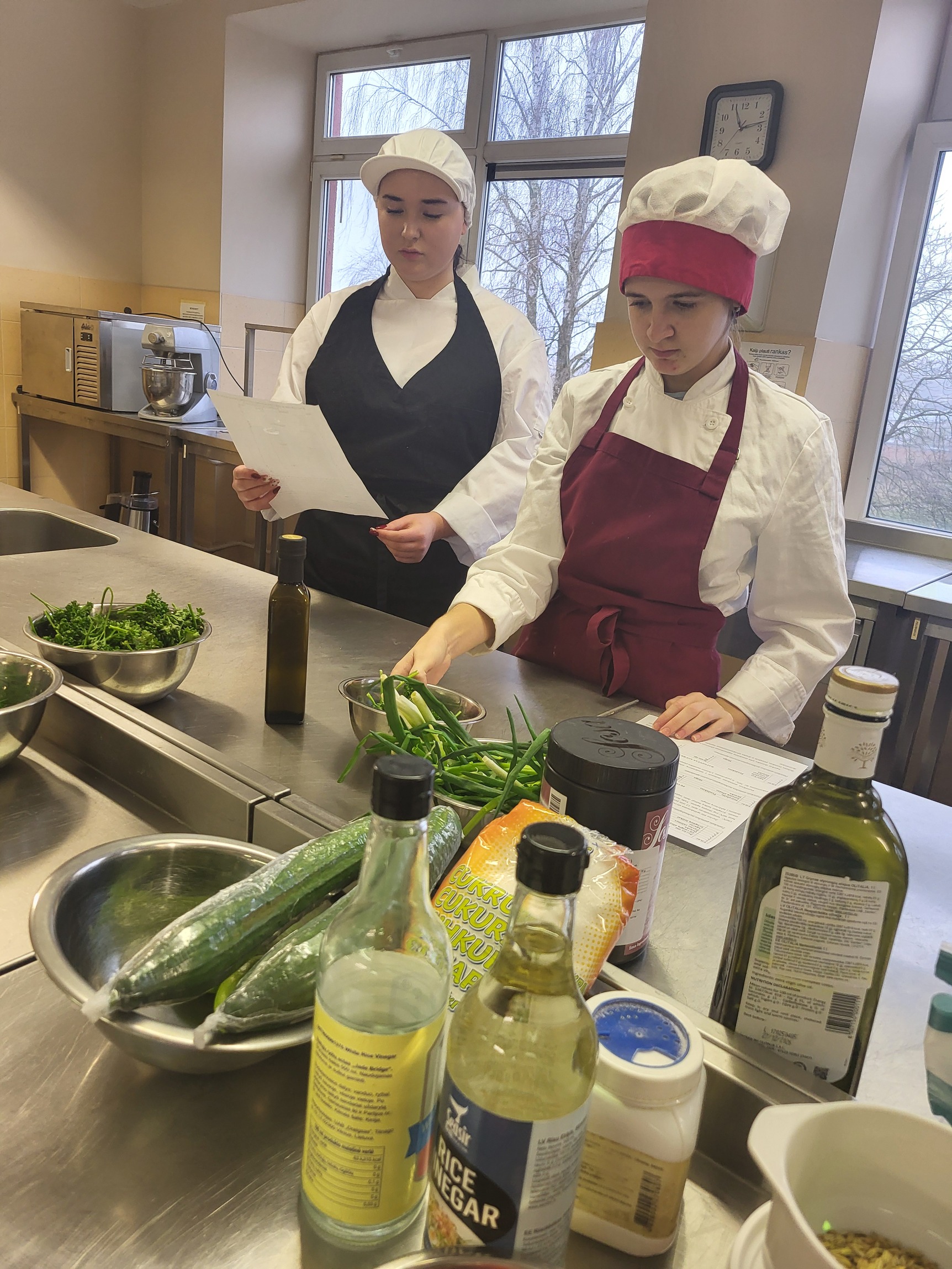 Integruotoje anglų kalbos ir maisto ruošimo pamokoje dalyvavo P89* merginos. Gamino garuose virtą žuvį su orkaitėje keptomis daržovėmis, žaliųjų žirnelių kremu ir grietinės padažu, o anglų kalbos pamokoje poromis sėdo prie kompiuterių ir vertė receptūrą, patiekalo paruošimo eigą bei darė skadres pristatymui apie žuvų patiekalus ant Kūčių stalo.
