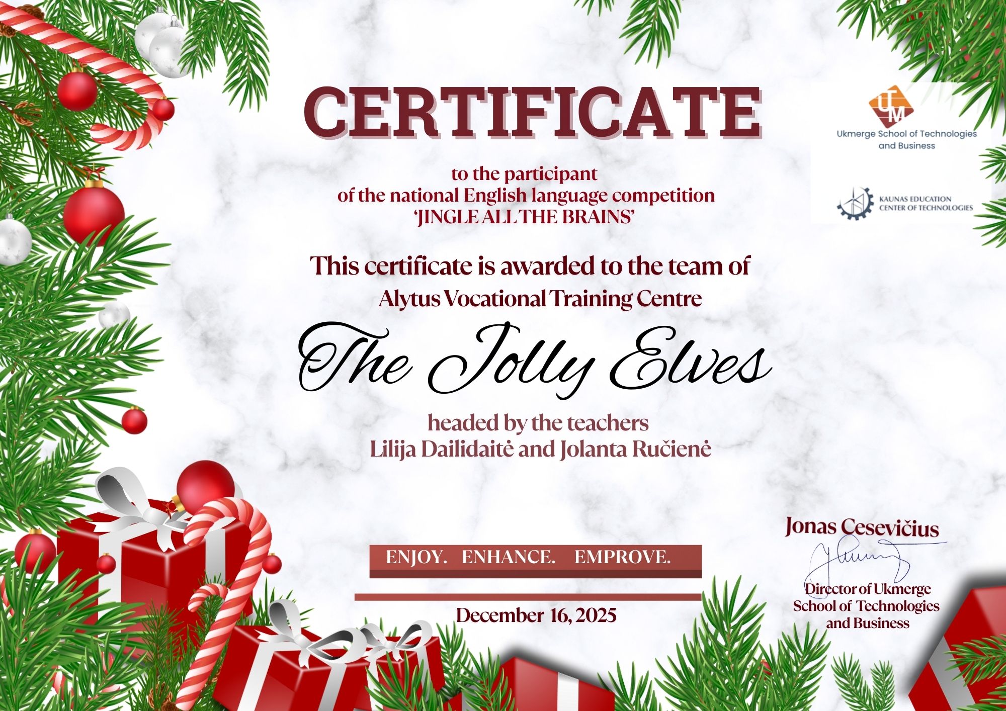 Moksleiviai Adrijus Urbanavičius P4 gr., Eivardas Žebrauskas P4* gr., Simona Baliukonytė P91 gr., Milda Brūzgaitė P91 gr., Miglė Zinkevičiūtė P91gr., Ernesta Kareskevičiūtė P6 gr. dalyvavo nuotoliniame respublikiniame anglų kalbos konkurse "Skambančios smegenys", kurį organizavo Ukmergės technologijų ir verslo mokykla bei Kauno technologijų mokymo centras. Užimta ketvirtoji vieta leidžia manyti, kad anglų kalbos žinios, gilus kalėdinio laikotarpio Europos šalių papročių žinojimas ir greita reakcija yra tikrai geri.