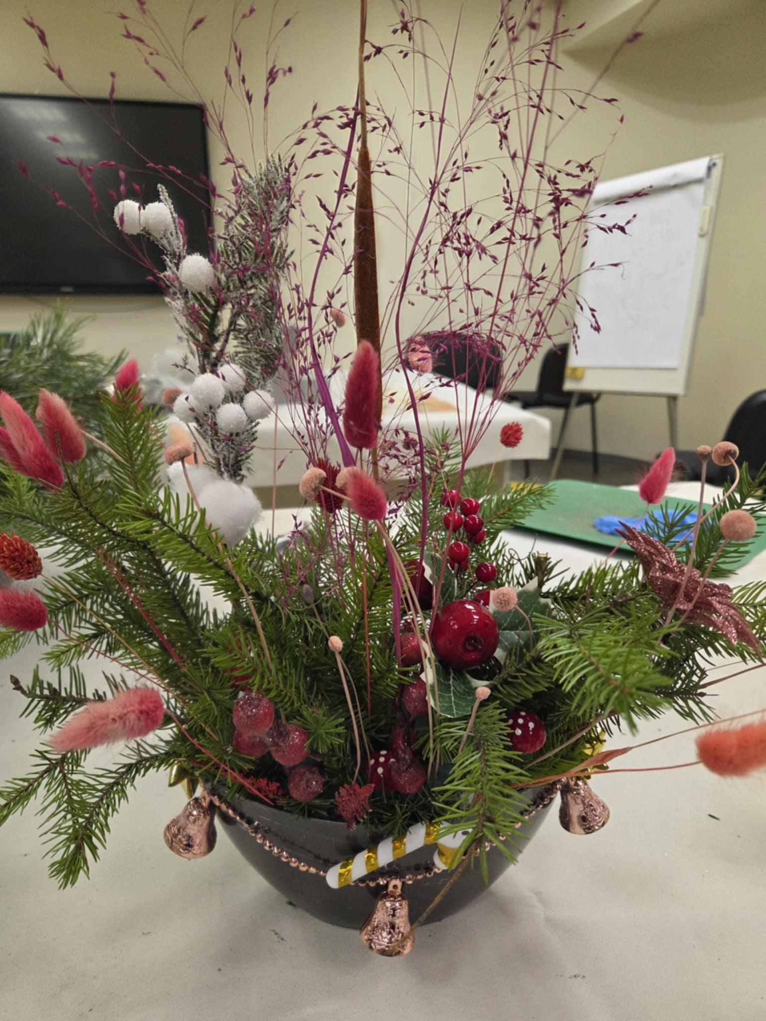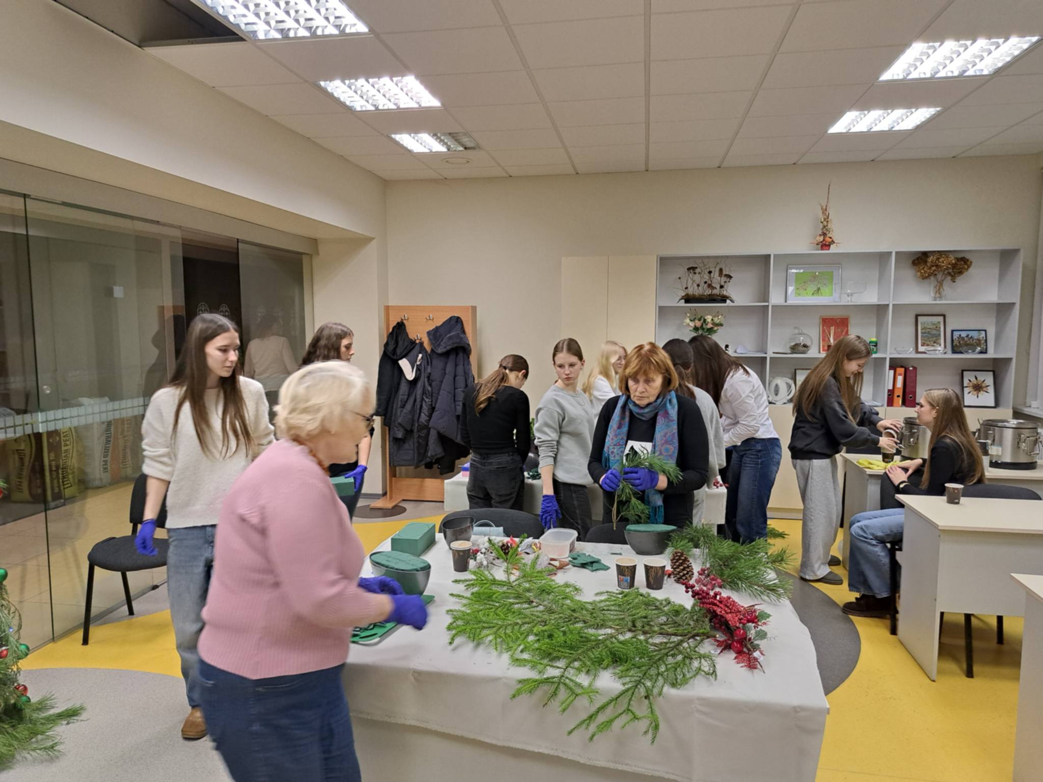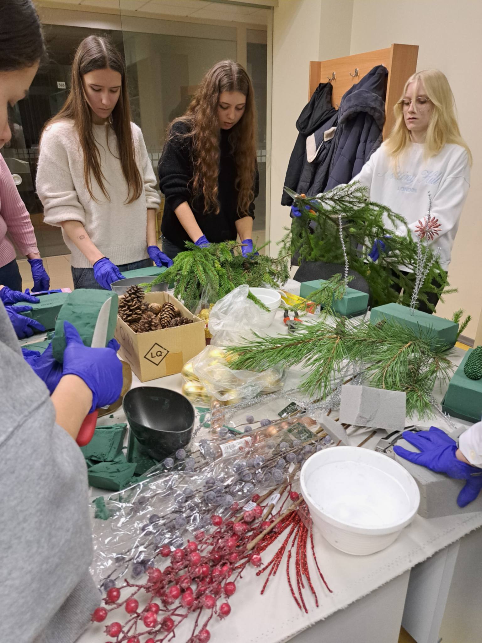 Kūrybinis procesas vyko jaukioje, bendruomeniškoje atmosferoje – dalyviai aktyviai bendravo, dalijosi idėjomis ir džiaugėsi savo darbo rezultatais. Kiekviena sukurta kompozicija tapo išskirtiniu rankų darbo kūriniu, pripildytu šventinės nuotaikos.