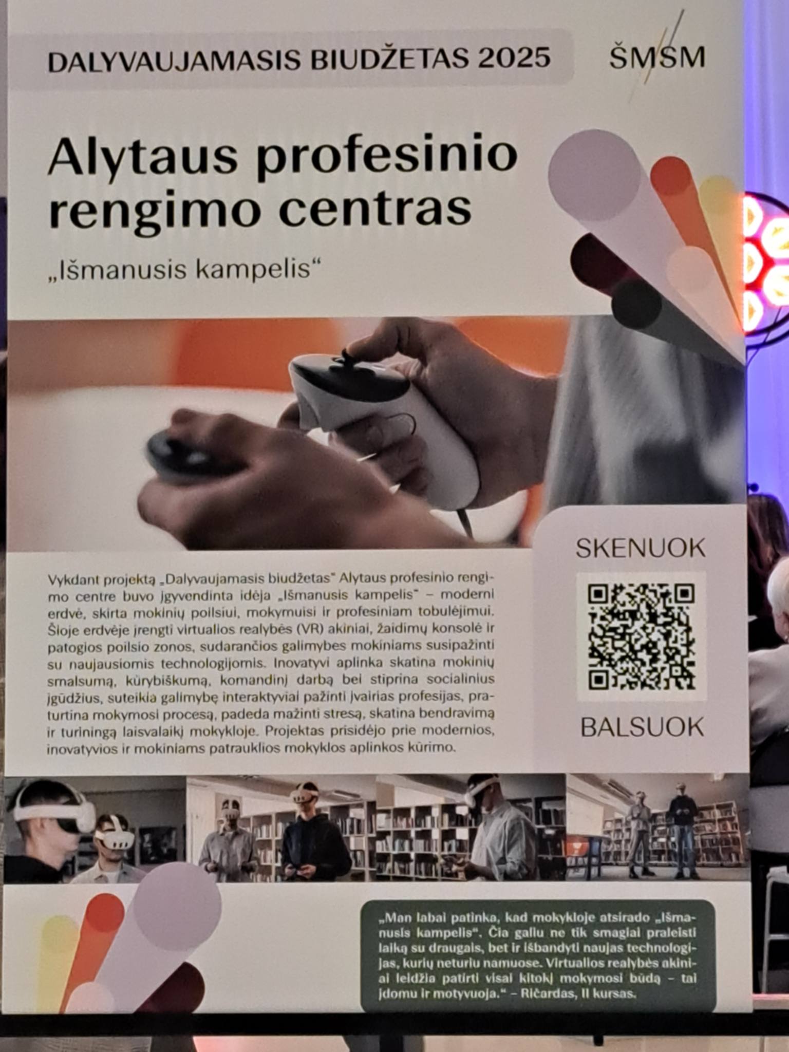 Praėjusiais metais Alytaus profesinio rengimo centre įgyvendintos dvi mokinių idėjos. Idėja dar labiau skaitmenizuoti mokyklos gyvenimą buvo realizuota projekte „Išmanusis kampelis“: mokymo bazė papildyta išmaniaisiais akiniais mokyklos bibliotekoje. Projektas „Daugiau laiko gryname ore“ prisidėjo prie jaukesnės aplinkos kūrimo – Varėnos profesinio mokymo skyriuje įrengta lauko pavėsinė.