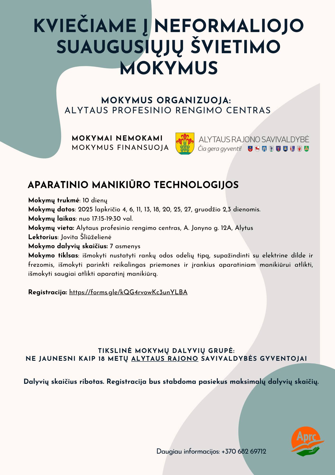 Kviečiame Alytaus rajono savivaldybės gyventojus dalyvauti mokymuose „Aparatinio manikiūro technologijos“!