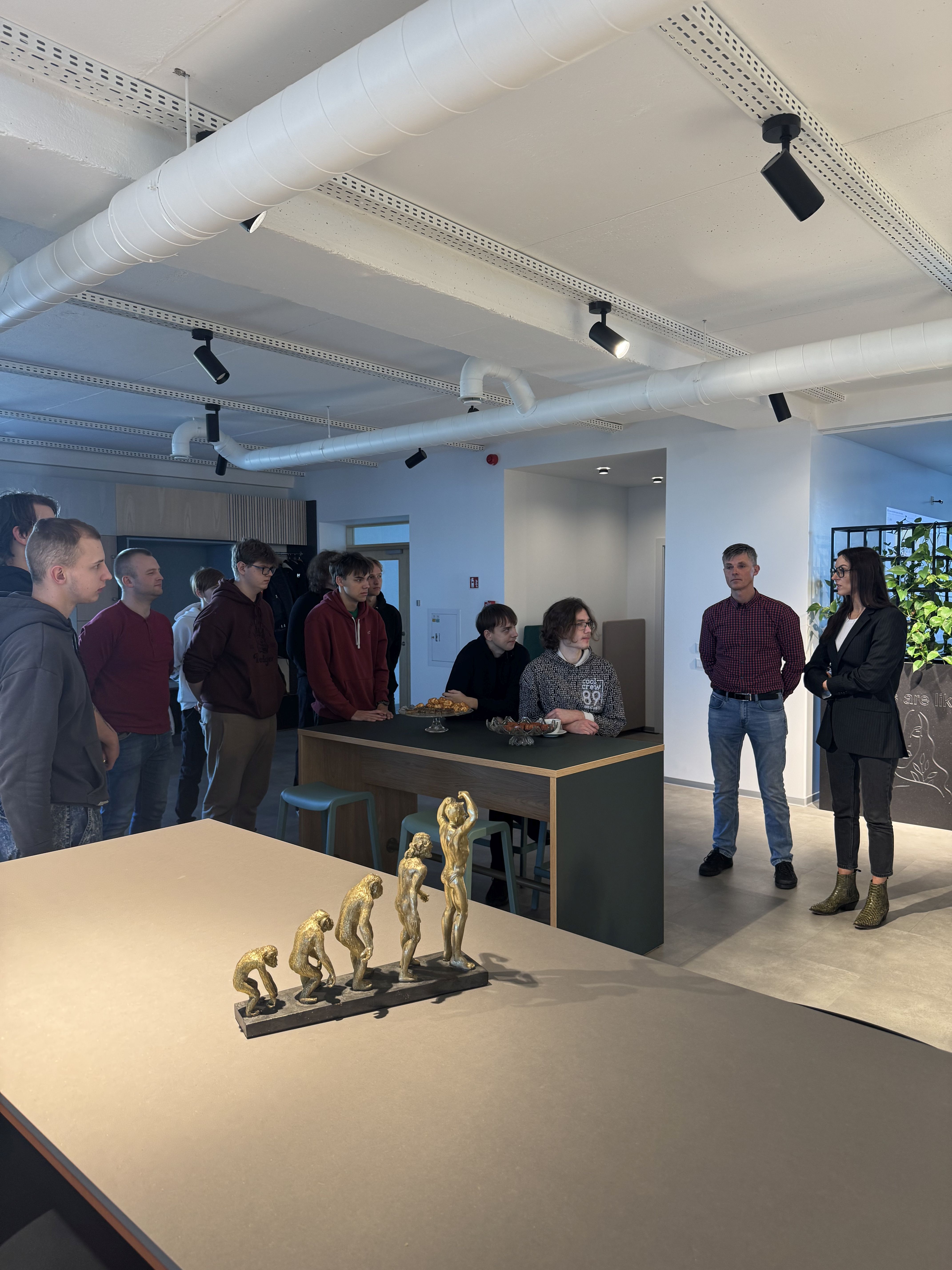 Vizito metu mokinius šiltai pasitiko ir apie įmonės veiklą, jos struktūrą bei darbuotojų svarbą gamybos procese papasakojo personalo vadovė Rūta Kareivaitė-Ruminienė. Įmonės atstovai pristatė gamybos technologinius procesus, supažindino su moderniais įrenginiais ir automatizuotomis sistemomis, kurios taikomos baldų gamyboje.